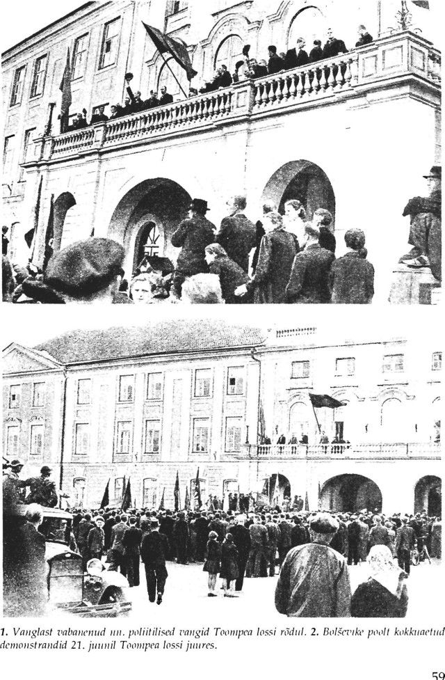 1. Stalini käsutäitja Ždanov Tallinnas Nõukogude Liidu saatkonna rõdul kommunistide poolt kokku käsutatud rongkäigu möödumisel. Temast vasakul Säre, Lauristin, Keerdo, Ruus ja Botskarev. 2. Eesti lipu puruksrebimine bolševistlike elementide poolt Tallinnas Pikal tänaval 17. juulil 1940. a. korraldatud rongkäigu ajal. Paljud rahvuslikult häälestatud sõdurid ja tsiviilisikud astusid välja Eesti lipu kaitseks. Sellele järgnesid massilised arreteerimised.