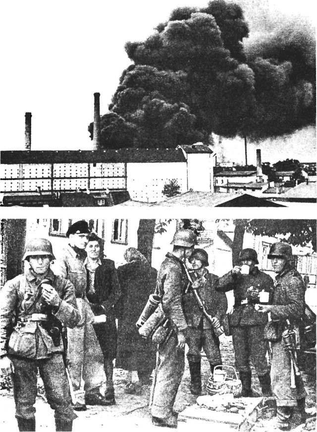 1. Bolshevike poolt põlema süüdatud bensiini- ja petroolumitangid Tallinna sadamas. 2. Tallinna elanikud kostitavad saksa sõdureid varsti peale linna vabastamist