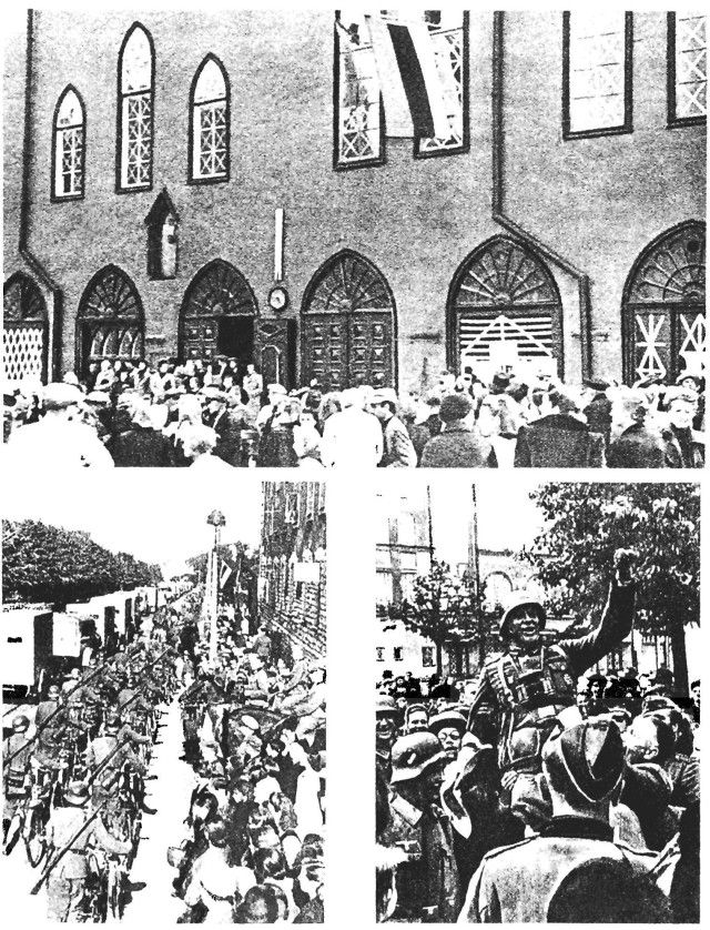 1. Tallinna vabastamise päeval kogunesid suured rahvahulgad Raekoja platsile, kus korraldati spontaanne meeleavaldus. Sel puhul heisati raekojal eesti ja saksa rahvuslipud. 2. Saksa jalaväerügemendi mööda marss oma ülemast elanikkonna elaval osavõtul peale Tallinna vabastamist. 3. Vabastatud Tallinna elanikkond tervitab saksa sõdureid.