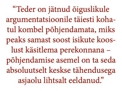 Eriliselt tähelepanuväärne on Tederi seisukoha juures see, et ta on jätnud õiguslikule argumentatsioonile täiesti kohatul kombel põhjendamata, miks peaks samast soost isikute kooslust perekonnana käsitlema ning on seda absoluutselt keskse tähendusega asjaolu lihtsalt eeldanud.