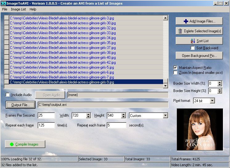 ImageToAVI will quickly convert a list of image/picture files into an AVI video. That video can then be loaded into your favorite DVD authoring program and burned to disc. With this neat little program you may choose to create video for DVD, SVCD and VCD. An audio file can be added for background music and your own background picture can be added as well. You may even customize the length of time to display each image. Want to create your own mini video clip instead of a slideshow? No problem. File formats supported: input: BMP, JPEG, and GIF --> output: standard AVI
