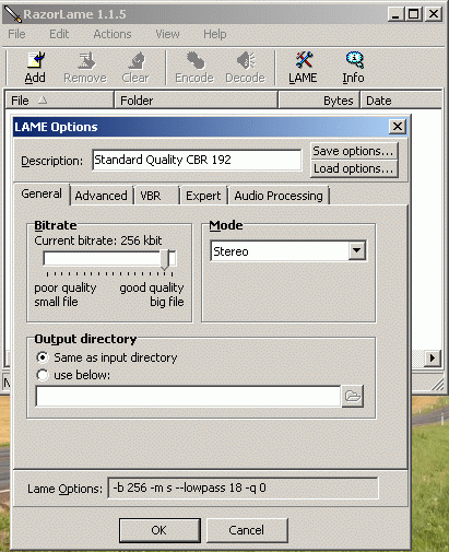 RazorLame is a so-called front-end for use with LAME. LAME is a great MP3-Encoder: it's very fast, it produces high-quality files, has many advanced features (like Variable Bitrates and Joint-Stereo), and it's open source.