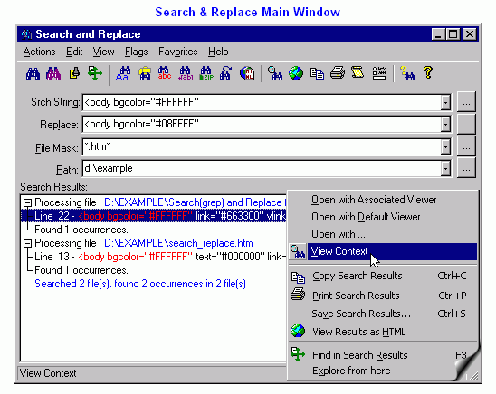 Search and Replace for Windows is a search (grep) utility that can find (and replace) one or more strings in multiple files, including files in ZIP archives. Operations can be done using simple search-replace, regular expressions, and scripts. Install fo-sar65.exe at 32bit systems and fo-sar65_64.exe at 64bit